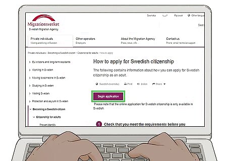 Complete an application to become a citizen. The Swedish citizenship application is only available in Swedish It requires basic identification information about you and how long you've lived in Sweden. You'll also need to provide information about your family (if any) and employment in Sweden. You can complete the application online or download it and complete a paper application. The application is available on the website for the Swedish Migration Agency at https://www.migrationsverket.se/en/you-want-to-apply/swedish-citizenship/citizenship-for-adults/citizenship-for-adults.html