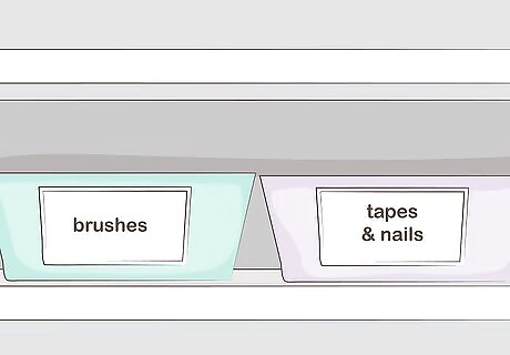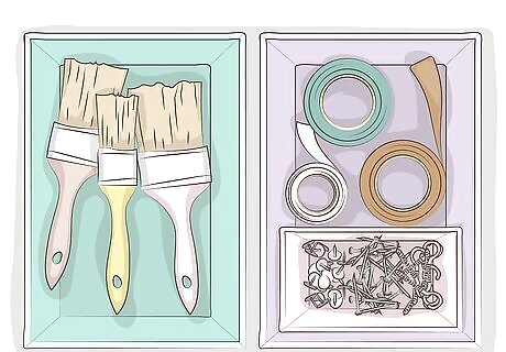 Sort items by category. Buy or source bins, boxes or baskets to store your smaller items like tools, paint brushes and cleaning supplies. Keep similar items together.