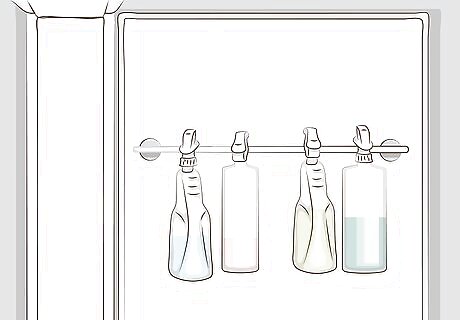 Hang up your spray bottles. You can hang them by the neck from a towel bar. Alternatively the slots in a hanging caddy are the perfect size for bottles of cleaning spray. Using a clear plastic caddy will make it easier to find the spray bottle you're looking for.