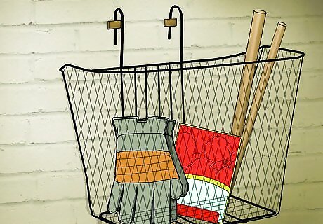 Hang a bike basket on the wall to hold a variety of small items. Bike baskets are designed to be easily hung, so they make an ideal option for hanging from the walls in your garden shed. Use them to store miscellaneous items like gloves, seed packets, pegs, or other small items that might be laying around otherwise.