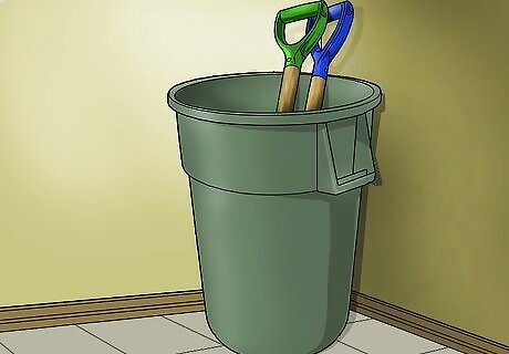 Gather your large tools into buckets to keep them in one place. If you don't have a lot of room or hanging your tools isn't an option, try placing a large trash can or another container in the corner of your garage or shed. Then, place your rake, shovel, and other large garden tools into the bucket to keep them out of your way.