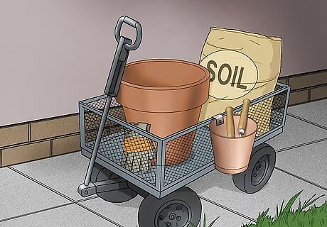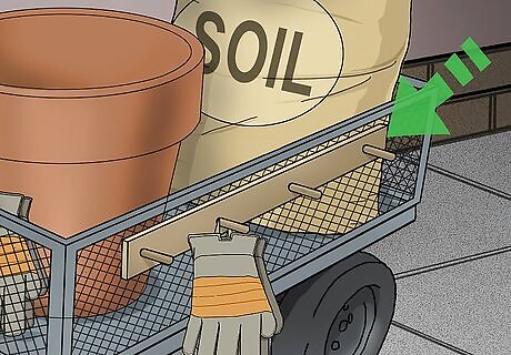 Repurpose a wheeled cart into a portable garden center. If you'll be doing a lot of planting, a cart can help you keep all of your supplies together. This is a great option if you'll be moving heavy objects like garden soil or large ceramic pots. Add baskets or buckets to the sides of your cart to hold all of the supplies you'll need in the garden. Make sure your cart has wire or slatted shelves so it can drain.