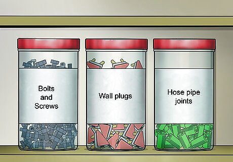 Place small objects in glass jars with lids, then line up the jars on a shelf. Your odds and ends will look organized and quaint when they're displayed in glass jars along a shelf. This will help you keep similar items grouped together, and the lids will keep the objects from spilling if the jars are knocked over. Small glass jars are the perfect place for keeping your extra seeds! Use chalkboard paint or paper labels to help you remember exactly what's in the jar