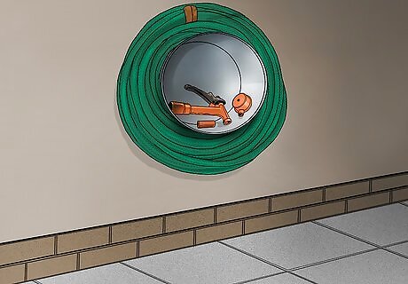 Mount a bucket on the wall to store your garden hose and attachments. Hang the bucket so the bottom is flush against the wall. You can store your garden hose by wrapping it around the bucket, then use the inside of the bucket as a shelf for storing your sprinklers, spray nozzles, or other attachments.