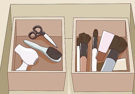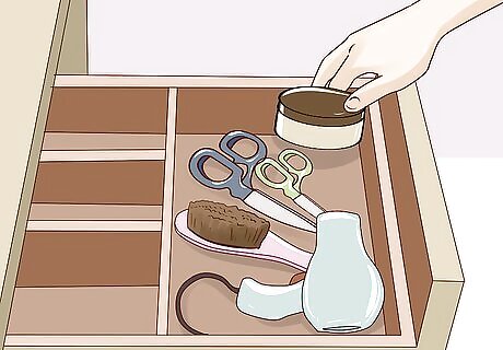 Put the largest items in the largest compartment first. Large items could include things like combs, electric shavers, or facewash. Organizing them in your drawers first will leave enough room for smaller products. Continue to organize them by type, but group the larger things together and keep them in the same compartment.