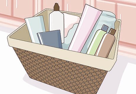 Place items in baskets if you have no drawer space. Purchase plastic or wood baskets from a department store or online. Put the baskets on top or under your sink and carefully put different categories of products in them. If your baskets are on your sink, put your daily-use items in them for easy accessibility. You can also label each basket so that you can find your products faster.