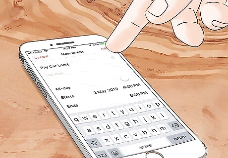 Set reminders on your computer or smartphone. Reminders can help ensure that a bill doesn't slip through the cracks, especially if it's something for a relatively small amount that you frequently forget. Paying bills late can hurt your credit, particularly credit card payments that are reported to the credit bureaus. Set your reminder a day or two before the bill is due and pay the bill as soon as you get the reminder. For example, if you have a music streaming subscription that's only $9 a month, you may find that you forget to pay it until you get a reminder from the streaming service or find out that you can no longer access your music. Setting a reminder will help ensure that you don't forget about it. If you're using a digital calendar on your smartphone or tablet, you can simply activate reminders for each of the bills you add to your calendar.Tip: Make sure your reminder is set for a time when you'll actually be able to read it and act on it. Reminders won't help if they go off in the middle of the night when you're asleep.
