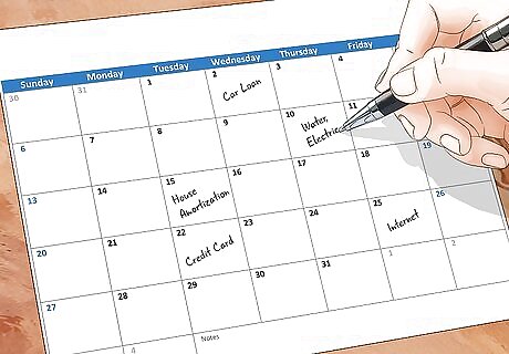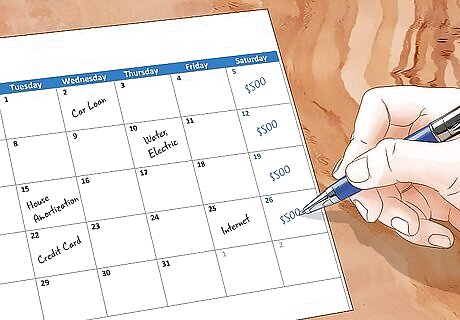 Put the due dates for each of your bills on a calendar. You can either buy a calendar you like or create a blank monthly calendar on the computer. Most word processing or spreadsheet apps have a calendar template you can use. Then type or write the name and amount of the bill on the day it is due. You can use different colored inks to signify how a bill is paid. For example, you might use blue ink for bills that are auto-drafted and red ink for bills that you have to pay manually on the due date. If you're creating your calendar on the computer, you can use text formatting to indicate whether the amount of the bill is an exact amount or a budgeted estimate. For example, you might use regular font for exact amounts and italicized font for a budgeted estimate.Tip: If you have to mail in your payment, put the bill on your calendar for the date it has to be mailed. This will typically be a couple of days before the final due date.