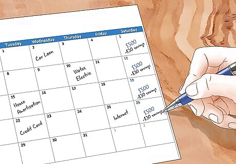 Include your income on your calendar. After you've put all your bills on your calendar, add your income on the days that you get paid. If your pay varies from paycheck to paycheck, use a budgeted estimate on the lower end of the range. For example, if you get paid weekly and your pay ranges from $500 to $700 a week, you might include the $500 amount on your calendar. If you've decided to use different colored inks, green is typically the best color to use for income. This is the color used most often on banking and budgeting apps for income and indicates a deposit of money.