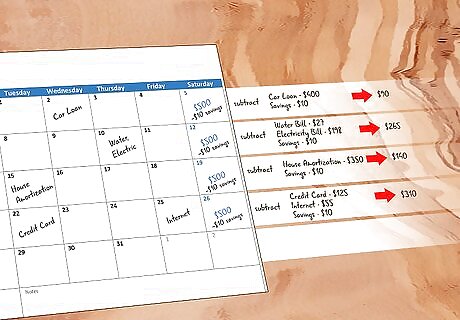 Add investment contributions or savings goals. If you're contributing to an investment account or saving up for a specific reason, add that amount to your calendar along with your bills. Treating your savings or investment as though it's a regular bill will get you in the habit of saving regularly. It can be difficult to get in the habit of saving, so don't be afraid to start small. Even small contributions add up over time. For example, even if you can only guarantee $10 a week towards your savings goal, by the end of the year, you will have saved $520.