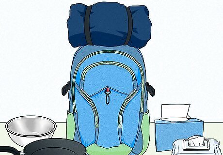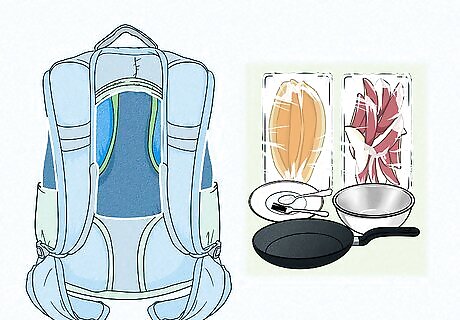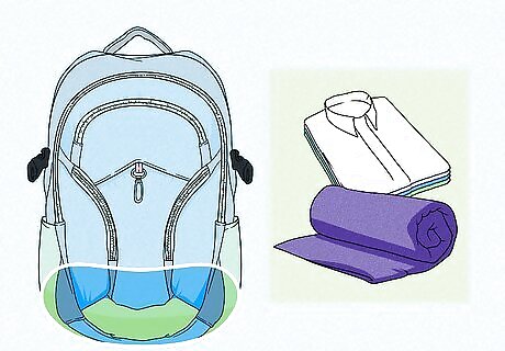 Fill in packing gaps with soft items like clothes. For each layer of your backpack (bottom, middle, top), pack your hard items with firm shapes first. Then, use malleable items like spare clothes, a rain jacket, or a blanket to fill in the space between the hard items. This method makes the most of the space in your backpack and also stabilizes the hard, heavy items so they don’t move around while you hike. Use stuff sacks (drawstring bags for camping and hiking) to keep like items together or to compress soft items like clothes and blankets.