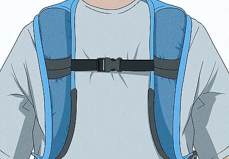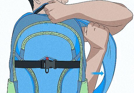 Slide the backpack onto your shoulders. First, slide the arm that’s on the same side as the backpack into a shoulder strap. Lean forward to shift the backpack onto your back and then slide your other arm into the other shoulder strap.
