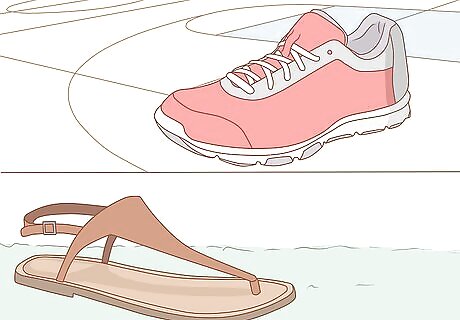 Select appropriate shoes. Volleyball shoes are designed for court use, and can lose traction if you wear them on dirt or grass. Keep them in your bag, and wear sandals or other shoes on your way to practice. Even if you wear ordinary sneakers while playing, it can be nice to change to a less sweaty pair of shoes afterward. Consider packing running shoes on conditioning days. If your shoes are old and losing traction, buy a "court grip" product.