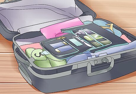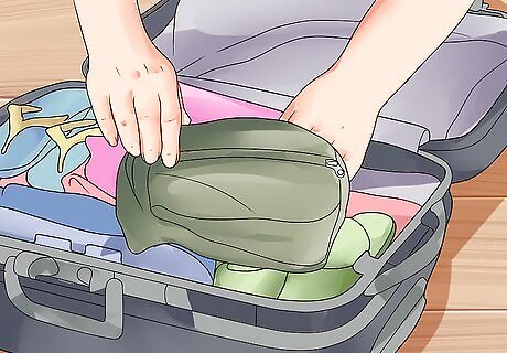 Put your toiletries on top. Put your toiletry bag on top of the clothes, then simply close the suitcase lid and you're done. If you can't get the zipper to close, it's important to avoid struggling and risking ripping the fabric or breaking the zipper. Use pressure to force the lid down as far as possible, if necessary, but if it won't go, it won't go. Don't force it and risk having to go buy a new suitcase at the last minute.