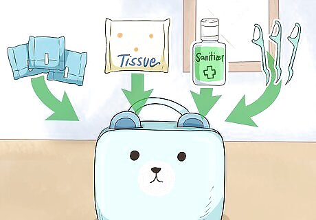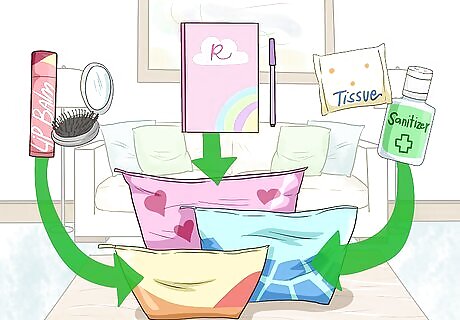 Put together a small toiletry kit of items like pads, tampons, and tissues. Grab a cute toiletry kit online or from a store and fill it with emergency toiletry items that you don’t want to be caught without. Keeping them separate in a little bag will keep them from getting lost in your purse or falling out. Fill your toiletry bag with: 3-5 pads or tampons A travel pack of tissues Floss Band aids Hand sanitizer Sunscreen Extra contacts or solution