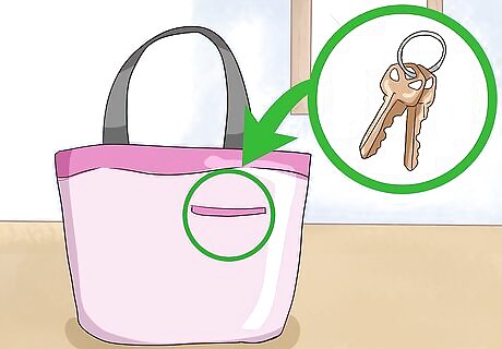 Set your keys in a small, secure side pocket. Even a big key ring can get lost inside your purse! To avoid needing to fish around for it all the time, slip your keys into a small, secure pocket in or on the side of your bag. You can also put a keychain or two on the ring to make it easier to find. If you put your keys in an outer side pocket, make sure it zips up so the keys don’t slip out or get stolen.