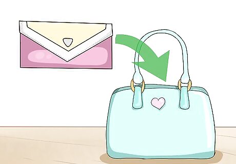 Put your wallet into the large, main compartment of your purse. Your wallet should fit nicely in the large pocket of most purses, making it easy to grab whenever you need it. Keep it stocked with your ID or driver’s license, any credit cards or gift cards, and at least $20 in cash. You can also try carrying your cards and ID on the back of your phone case, and using a smaller coin purse for cash and coins.
