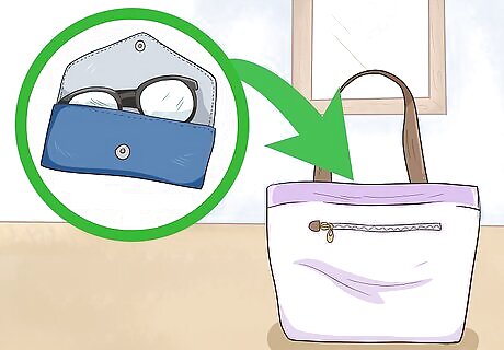 Keep your sunglasses in a case in the main portion of your bag. Sunglasses can get banged up or scratched in your purse, but you’ll definitely want to have them around to deal with bright sunlight. Protect them by slipping them into a case and placing them neatly in the main portion of your bag. You should also use a case for any eyeglasses you might use.