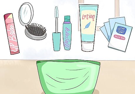 Fill a small makeup bag with lotion, lip balm, and any cosmetics. If you wear makeup, it’s always a good idea to carry a few items around with you in case you need to touch up during the day. If you only need a few small things, like mascara or lip balm, you can put them in your toiletry kit; otherwise, set aside a separate bag for cosmetics to stay organized. Fill your cosmetics bag with: Lip balm Lotion A brush A compact mirror Mascara Cover-up Blotting papers Any other makeup you use on a regular basis