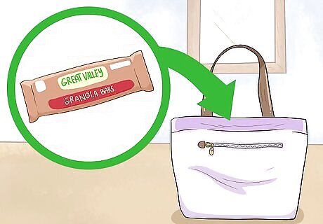 Bring snacks like granola bars if you know you’ll be away from home for a while. It’s never a bad idea to pack a couple grab-and-go snacks to keep you going throughout the day! Go for small, packaged options like granola bars or packets of nuts or pretzels. You can also pack your own snacks in a Ziploc bag, but make sure to close it tightly so it doesn’t pop open in your purse. Crumbs can accumulate fast in a purse, so make sure to throw out your food trash as soon as you can.