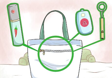 Keep a few safety items in easily accessible places. Your purse is a useful place to self-defense items that can help keep you safe and feeling empowered. You can stash a can of pepper spray, an emergency whistle, or even a personal safety alarm that lets off a siren when you use it. Make sure to keep these items in safe but easy to reach pockets, like a concealed, zippered pocket. Take the time to learn how to use the items before you start carrying them around. Some places have restrictions on safety items like pepper spray, limiting the size of the cans you can carry. Check the rules in your area before you buy!
