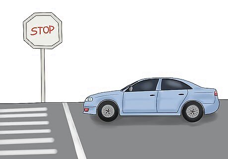 Stop completely at the stop signs. Throughout the test course you will see at least two stop signs. When approaching a stop sign ahead make sure your vehicle comes to a complete stop before the stop sign and/or white stop line painted on the ground. Before proceeding, slowly turn your head to the right and to the left to check for oncoming traffic, pedestrians or animals. If turning, use the appropriate turn signal to indicate your turn. Then, proceed ahead to the end of the test course as instructed by the examiner.