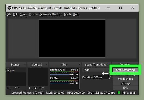Click Stop Streaming to end the stream. It's at the bottom-right corner of the OBS app. The button is the same you clicked to start the stream, though the text is different.