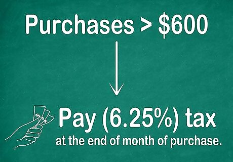 Determine when taxes are owed. If you purchase tangible personal property from an out-of-state retailer who does not collect Illinois state sales tax, you are responsible for paying that tax yourself. Generally, you can pay all sales tax at the end of each year. However, if you owe $600 or more, you must pay by the end of the month in which the purchase is made. Illinois state sales tax for general merchandise is 6.25%. Therefore, if you make $9,600 or more in purchases each year, you'd need to pay the sales tax before the end of the month in which you made each purchase. Otherwise, you can wait until the regular annual tax deadline.