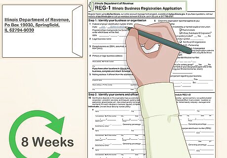 Complete Form REG-1. If you prefer, you can complete a paper registration form rather than registering online. The form can be downloaded at http://www.revenue.state.il.us/TaxForms/Reg/REG-1.pdf. In addition to the main application, you may have to complete additional schedules depending on the type of business you conduct. For example, if you sell alcohol or tobacco, you must complete additional schedules for those businesses. Once completed, mail your application to Central Registration Division, Illinois Department of Revenue, PO Box 19030, Springfield, IL 62794-9030. Allow 6 to 8 weeks for processing if you mail paper forms.