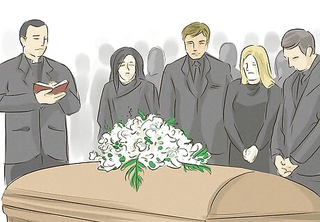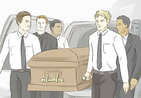 Choose pallbearers with your friends and family. The pallbearers carry the casket in and out of the church and at the cemetery, and it's considered a deep honor to be chosen for the task. This decision is often made by you and anyone else planning the funeral, but you may want to ask around to see who is interested in honoring your loved one in this way. However, do keep in mind that if they are actually carrying the casket (rather than rolling it), it really is heavy, so you may want to ask family members or friends who are able. Certain people may want to volunteer to be pallbearers. Typically, you have 8 of them. Keep in mind that being a pallbearer isn't the only way to honor a loved one at their funeral service. In some cases, the church will allow people to read the scriptures for the service, for instance.