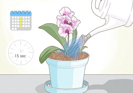 Water your orchid when the growing medium feels dry. Orchids don’t do well when they’re overwatered, so allow their growing medium to dry out before you water it again. Simply stick your finger in the soil to see if it feels dry. Then, water your plant for about 15 seconds and let the excess water run out of the drainage holes. If you have a plastic pot, look at your plant’s roots. Gray, shriveled roots mean it’s thirsty, while plump white or green roots mean it isn’t. Lift your orchid’s pot to tell if it needs water, too. A heavy pot means the potting medium is still soaked with water, while a light pot means your plant is thirsty. In the summer, you may need to water your orchid more often. If your orchid has thick leaves, it typically needs more water. If it has bulky faux bulbs, it typically needs less water. Yellow leaves are typically a sign your plant is being overwatered, while drooping leaves are usually sign it’s being underwatered. While many people recommend watering orchids about once per week, your plant’s growing medium, light, and humidity all affect how often it needs water. So, it’s best to regularly check the potting medium’s dryness.