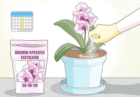 Feed your orchid an orchid-specific fertilizer in the spring and summer. Fertilize your orchid about once per week while it is actively growing. Simply dilute a balanced, liquid fertilizer (like 20-10-20) to ¼ strength and water your plant. About once per month, do not fertilize your orchid and simply flush its soil with water. Too much fertilizer can burn the roots and prevent flowering. Keep the orchid in indirect sunlight during the spring and summer. When a new flower spike grows, brace it with a tie or stake when it’s 5 inches (13 cm) tall. Note: Do not fertilize orchids in the winter or when they’re not actively growing. This can potentially harm your plant.