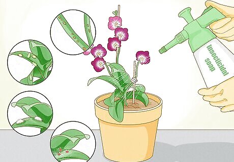 Get rid of pests with insecticidal soap or horticultural oil. Regularly inspect your plant’s leaves for scale insects, mealybugs, or spider mites. If you notice discolored leaves, a black sooty mold, or stickiness, treat the leaves with insecticidal soap or horticultural oil. Orchids aren’t very prone to pests, but they can become an issue.