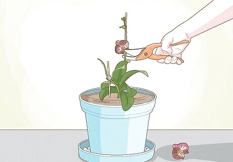 Prune off dead leaves and the flower stalk after blooming. Use a sterile pair of pruning shears or scissors to snip off any dying leaves or dead, brown leaves. After your orchid blooms and the flowers die, cut down the flower stalk to the base of the plant. Note: If you’re growing a Phalaenopsis orchid, cut the flower stalk above the second node on the stem. These orchids can bloom from the same stalk. It’s normal for most orchids’ flower stalks to turn brown after the flowers die. This can also be due to overwatering or too much light, so ensure your plant is getting the care it needs.