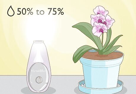 Maintain humidity around 50 to 75%. Because most orchids' are native to the tropics, they love humidity. Either place a humidifier near your orchid or set its pot on top of a shallow tray filled with water and pebbles. Use a hygrometer to monitor your orchid’s humidity. Or, download a hygrometer app on your smartphone to check the humidity.