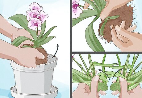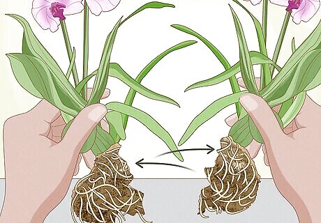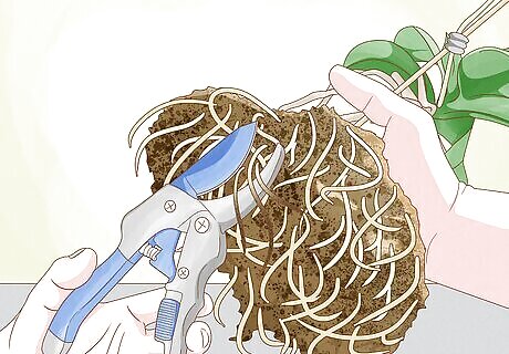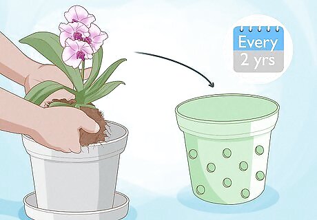 Repot your orchids about every 2 years. Most orchids only need to be repotted when their potting medium starts to decompose, which is generally every 2 years. You may need to repot your orchid sooner if the plant’s roots are outgrowing its pot, the lower leaves are dying, or its roots are dying. Choose a slightly larger pot to repot your orchid in. Remove any dead, dying, or mushy roots with clean shears or scissors before repotting your orchid. Warning: Wait to repot your orchid until its flowers die and fall off. Repotting your orchid as it's blooming can cause the flowers to die.