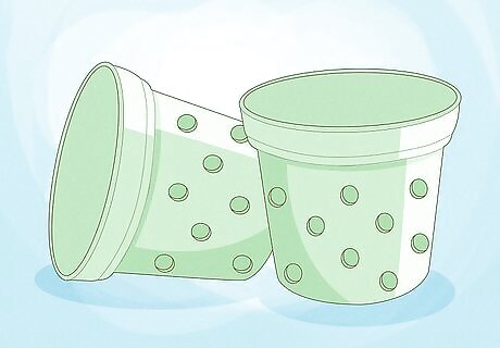 Select a snug pot with drainage holes. Many orchids are comfortable being slightly root-bound, so choose a small pot that fits its roots snugly inside. Make sure the pot has plenty of drainage holes on the bottoms and sides; orchids don’t like sitting in wet or soggy growing media. The following pots are great for growing orchids: Clear plastic pots, which provide more sunlight to the roots. These also allow you to easily inspect the orchid’s roots. Terracotta pots, which are very porous and dry quickly. As a plus, they’re typically inexpensive. Net pots, which have wire mesh to create a breathable environment. You can hang these to give your orchid better sunlight. Wooden pots, which are made of rot-resistant wood. Just line these pots with sheet moss before adding your potting mixture. If you don’t like the look of your pot, place it inside of a decorative pot. Avoid using decorative pots as your orchid’s growing pot, as the glaze can be harmful. Some orchids, such as cymbidiums, need longer pots to accommodate their long root systems.