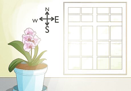 Set your orchid in a spot that gets bright, indirect light. Most orchids need a lot of light to thrive, so set your plant in a south or east-facing window. Direct sunlight can cause orchids to burn while too little light can prevent flowering, so avoid placing them in a west or north-facing window, respectively. Check your orchid's leaves to see if it's getting enough light. Healthy orchid leaves are light green with yellowish tones. If the leaves are dark green, the orchid isn't getting enough light. If the leaves are yellow, brown, or reddish, it means they're getting too much. Low-light orchids like Paphiopedilum, Phalaenopsis, and Oncidium, do best if they get northern or eastern light. Moderate to high-light orchids like Cattleya, Dendrobium, and Vanda prefer getting westerly or southerly light. If you only have direct light, place a sheer curtain in front of your window. If you don’t have a lot of light, place your orchid under a grow light.