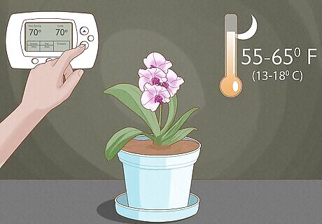 In early fall, drop the temperature by 10 to 15 degrees at night. In nature, cooler nighttime temperatures trigger orchids to rebloom. Starting in the early fall, lower the temperatures at night to 55 to 65° F (13-18° C) for about 3 to 4 weeks. Your orchid will start growing a new flower spike when it’s getting ready to rebloom. Most orchids bloom once per year. Make sure your orchid gets enough light, water, and fertilizer to ensure it reblooms, too. If your orchid drops its buds, it might be stressed. Make sure its receiving enough water, light, and humidity and that it’s not near any drafts.