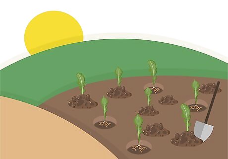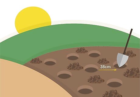 Make small holes about 15 inches (38 cm) apart. Use a small gardening hand shovel to dig as many holes as you have seedlings. Make them about as deep as the cells are. Each hole should be 14-16 inches (36-41 cm) away from the others.