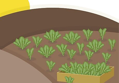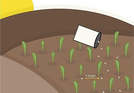 Space seeds in rows that are 1 foot (.3 meters) apart. Sprinkle plenty of seeds along each row. After they sprout, thin the seedlings to 4 to 6 inches apart so the plants will have enough room to grow. You can use the thinned out seedlings to make a salad.