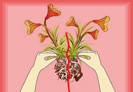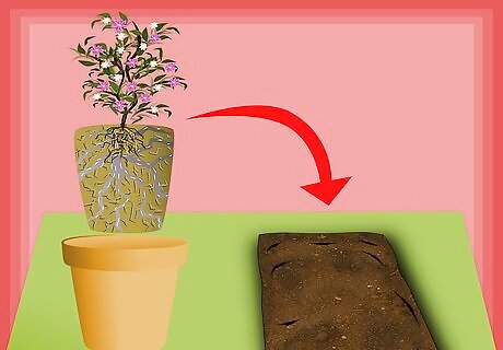 Remove the perennial from the growing container. Hold the container upside-down and shake it lightly to loosen the perennial's roots. Gently pull the plant from the container. Examine the root ball. If many roots are visible, the plant is likely rootbound. To force new growth in a rootbound plant, slice off the bottom 1/2-inch (1.27-cm) of roots using a sharp knife. With your fingers, break up the root ball by separating the roots along the side of the root ball. If you don't break up a rootbound plant, the roots may continue a circular growth pattern and stunt the plant's growth.Plant Perennials Step 10Bullet1.jpg
