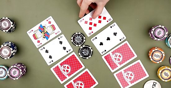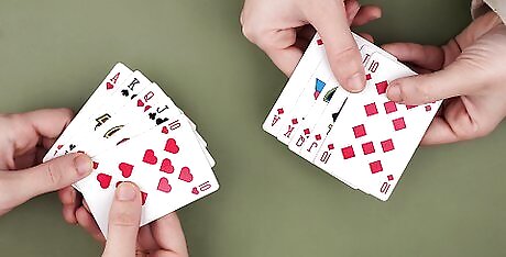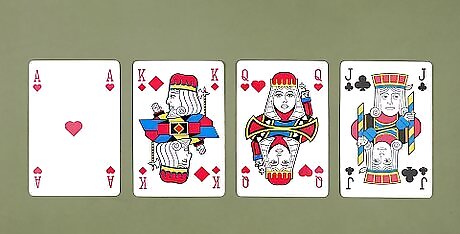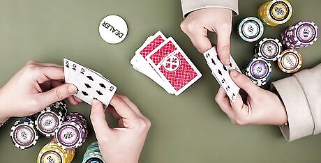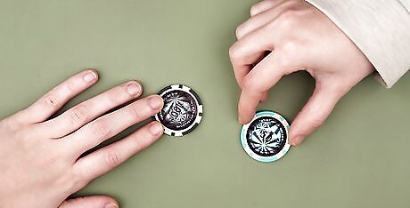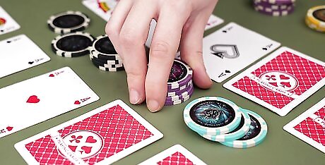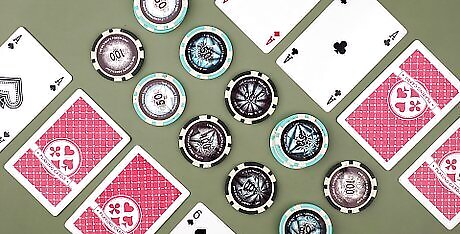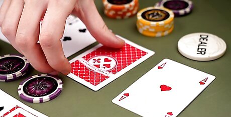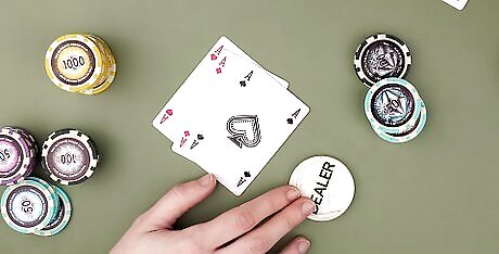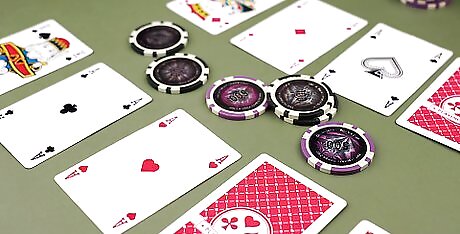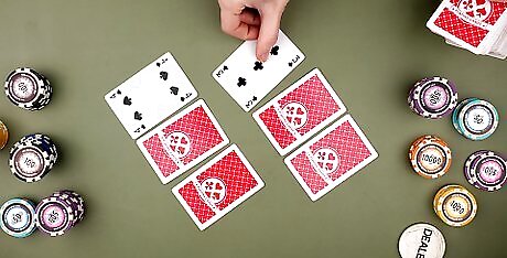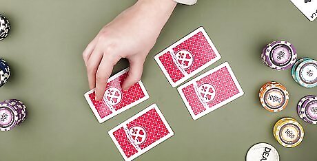 Keep your “hole cards” hidden from the other players. Each player will start the game with 2 face-down (or “hole”) cards and 1 face-up (or “show”) card. As the game continues, you’ll get 3 more show cards, then 1 more hole card. Don’t show your hole cards to the other players! Part of the challenge is keeping everyone guessing about what’s in your hand. By the end of the game, you’ll have a total of 4 show cards and 3 hole cards.