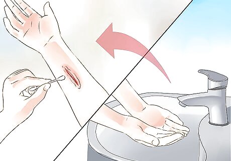 Wash your hands before treating wounds, giving medicine, or caring for a sick person. Whenever you are treating an injury or sickness, you need to take special care not to spread bacteria. Stop and wash your hands before dealing with the illness or injury at hand.
