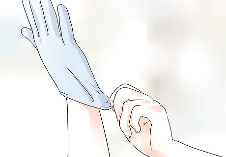 Put gloves on your clean hands. Carefully place your hands into the gloves one at a time. Be sure that each finger fits into its proper slot. The gloves should fit well, but not too tight.