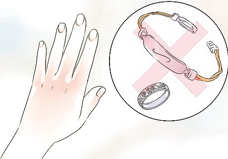 Remove any jewelry. Remove any rings or bracelets from your hands and store them in a safe place. Jewelry (even plastic jewelry) can easily damage your gloves.
