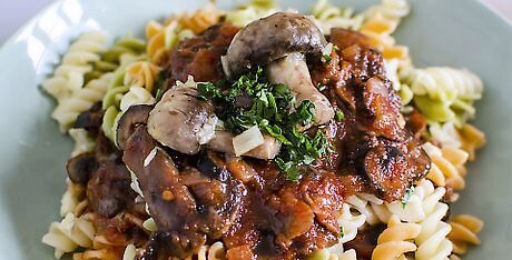 Add mushrooms to tomato-based pasta sauce. Mushrooms can give simple pasta sauce a rich, earthy flavor. Saute the mushrooms in olive oil with onions and garlic over medium heat for 5 to 7 minutes or until the vegetables are softened. Next, add the ingredients for your favorite pasta sauce, such as a can of crushed tomatoes, wine, and fresh herbs, and cook according to the recipe. You can also toss sauteed mushrooms into a finished pasta dish with any pasta sauce that you like.