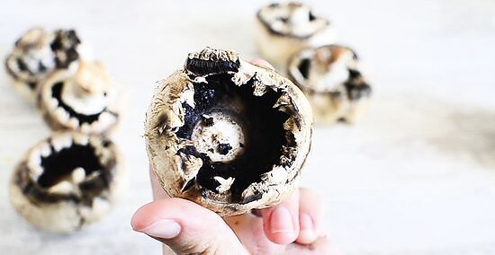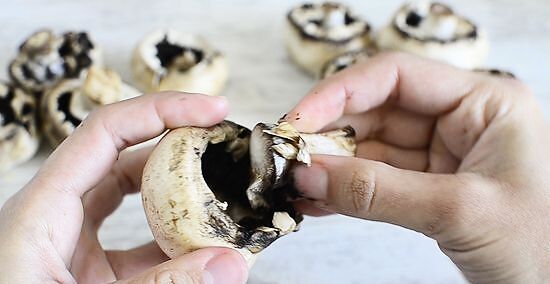 Scoop out the gills from under portobello mushrooms. Portobello mushrooms require a little extra preparation for stuffing. After you twist off their stems, hold the mushrooms in one hand, and use a spoon to gently scrape out all the gills from the underside. Throw away the gills.