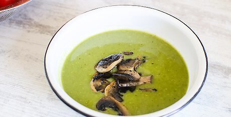 Mix mushrooms into soup. Mushrooms can add a nice meaty flavor and texture to your favorite soup. Start by sauteeing the mushrooms to cook some of the excess moisture out of them. Next, add them to your favorite soup base about 10 to 15 minutes before it should be done to ensure that they don't get soggy.