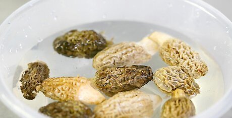 Rinse morels under cool water. After you’ve cut and trimmed the morels, run them under the sink to remove any dirt or insects. If the mushrooms still look dirty after rinsing, fill a bowl with cool water and a pinch of salt, and soak the morels for 10 to 20 minutes to remove the remaining dirt and debris. Agitate the morels periodically while they’re soaking to help loosen the dirt. Change the water as necessary while the morels are soaking. If you notice it becoming dirty, dump it out and add fresh, cool water. Add another pinch of salt as well.